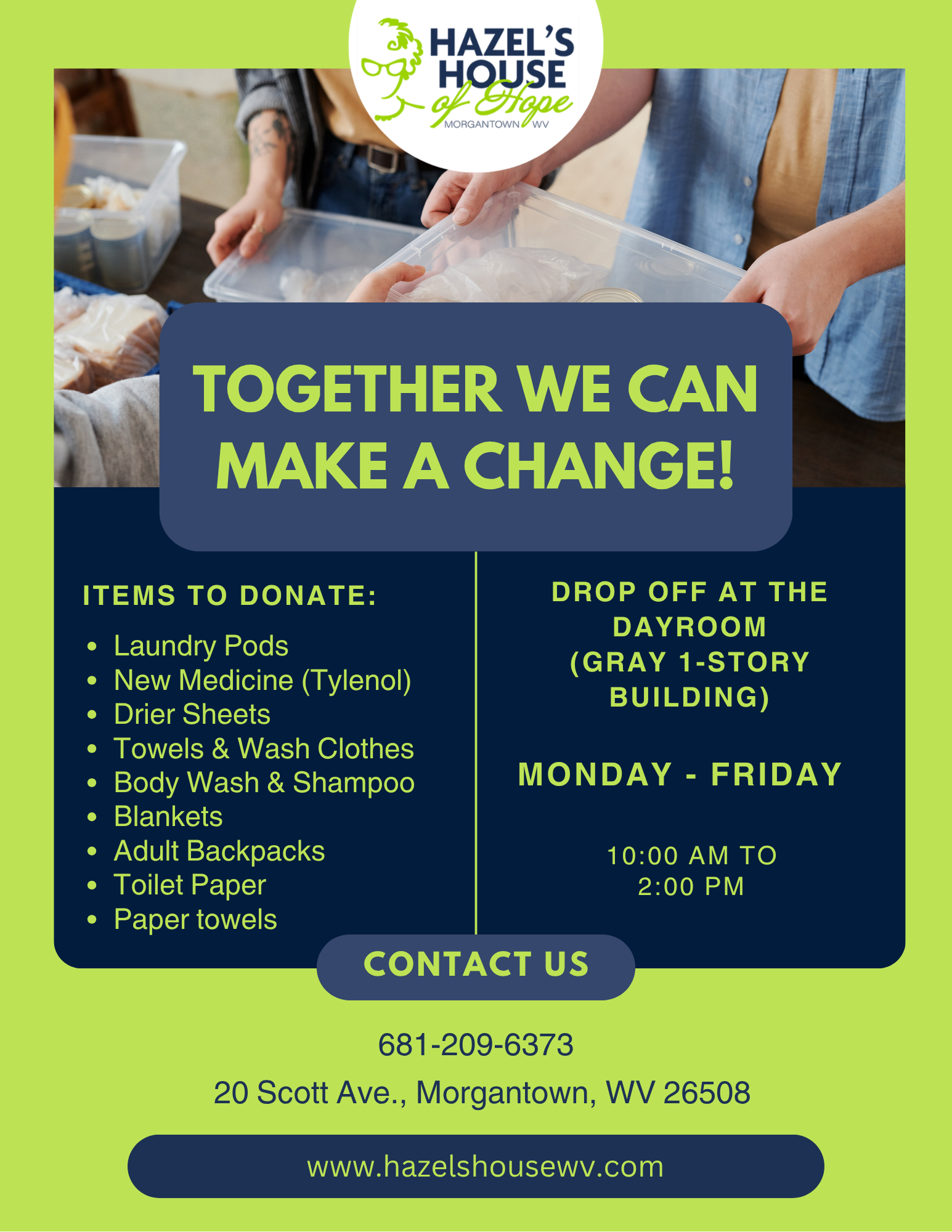 Mission: With the help of community partners, the primary goal of Hazel's House of Hope is to ensure food security, shelter, health, and financial dignity for the residents of Monongalia County and surrounding counties by fostering a synergetic, inclusive, and positive environment for all people suffering from homelessness, food insecurity, and substance use disorders in the community.